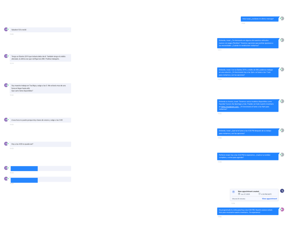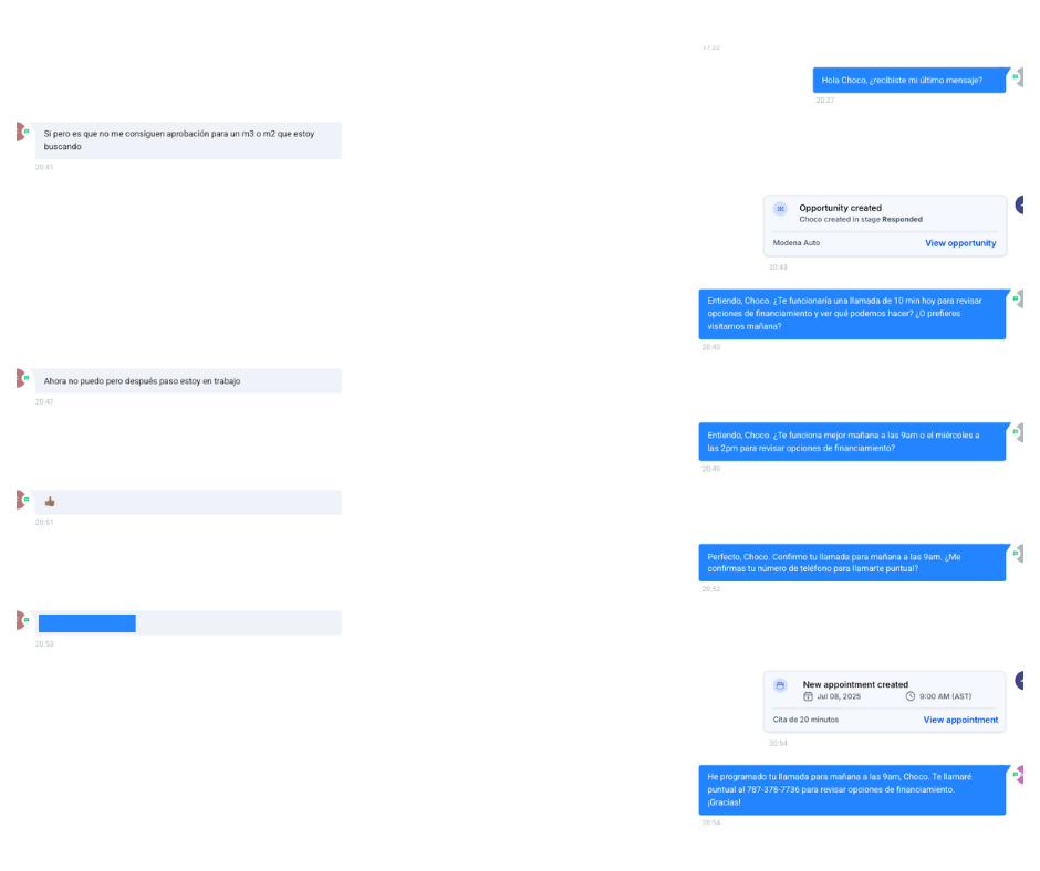 Spanish conversation showing AI booking car dealership appointment with natural flow