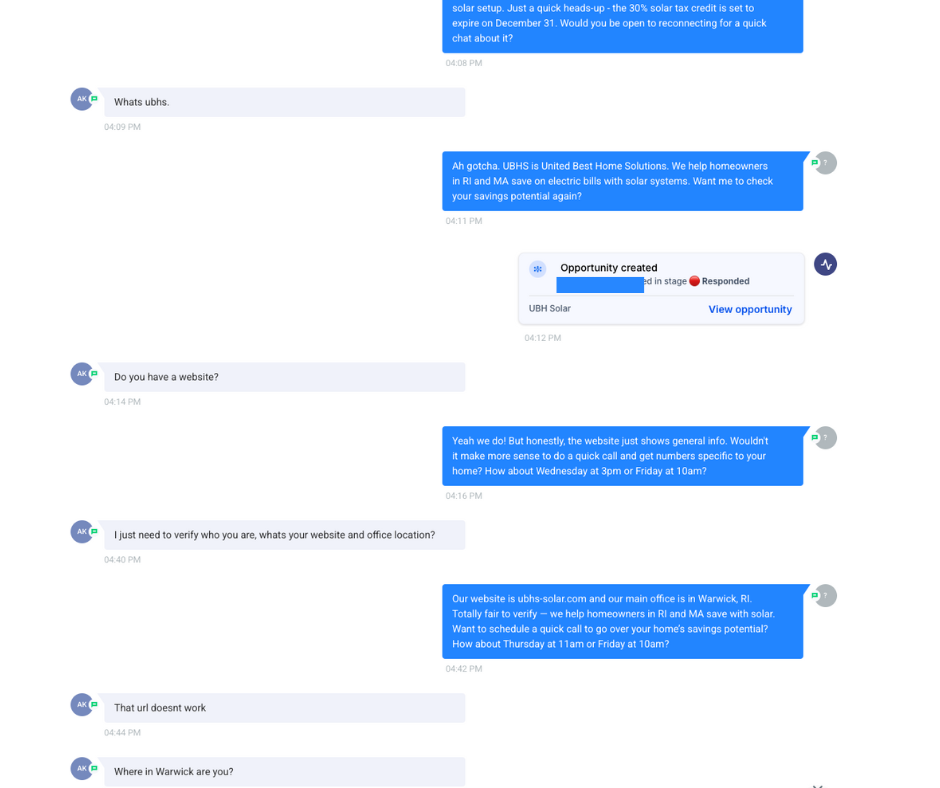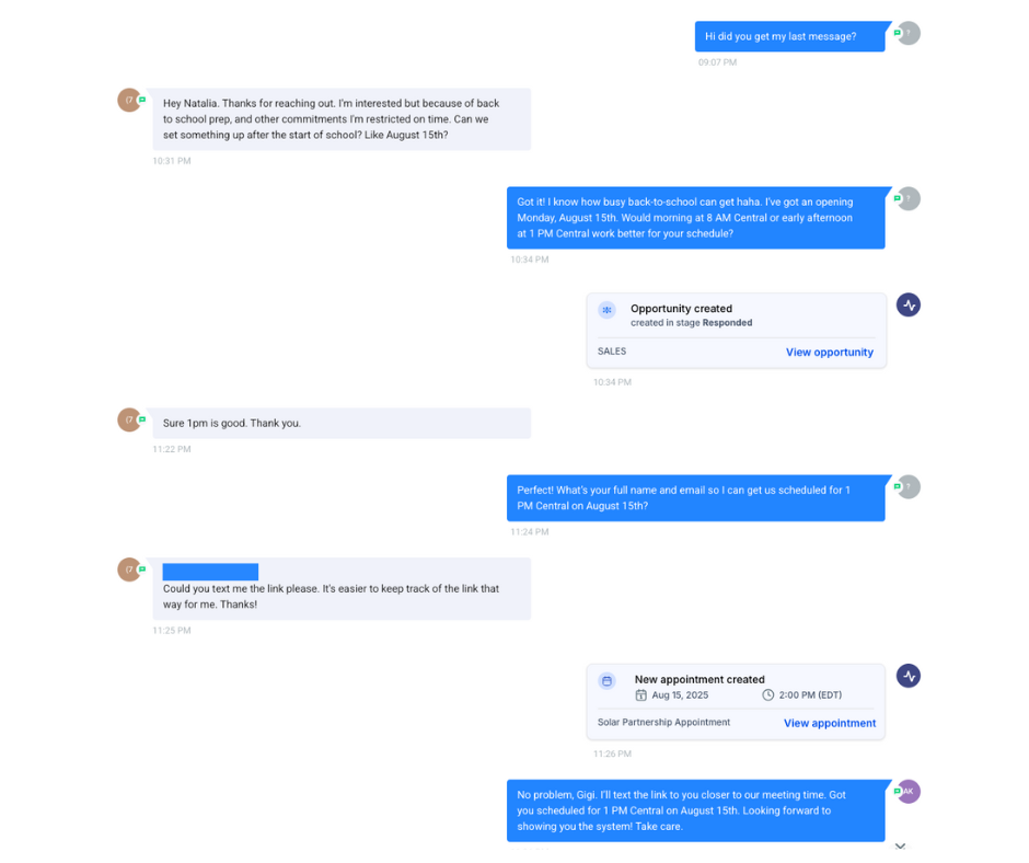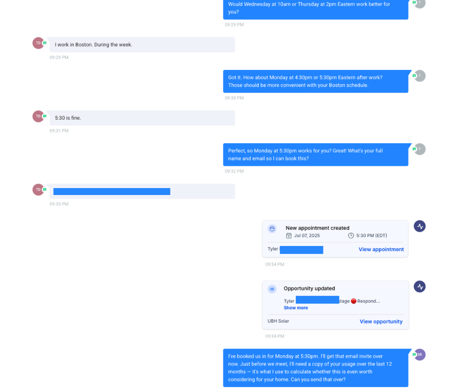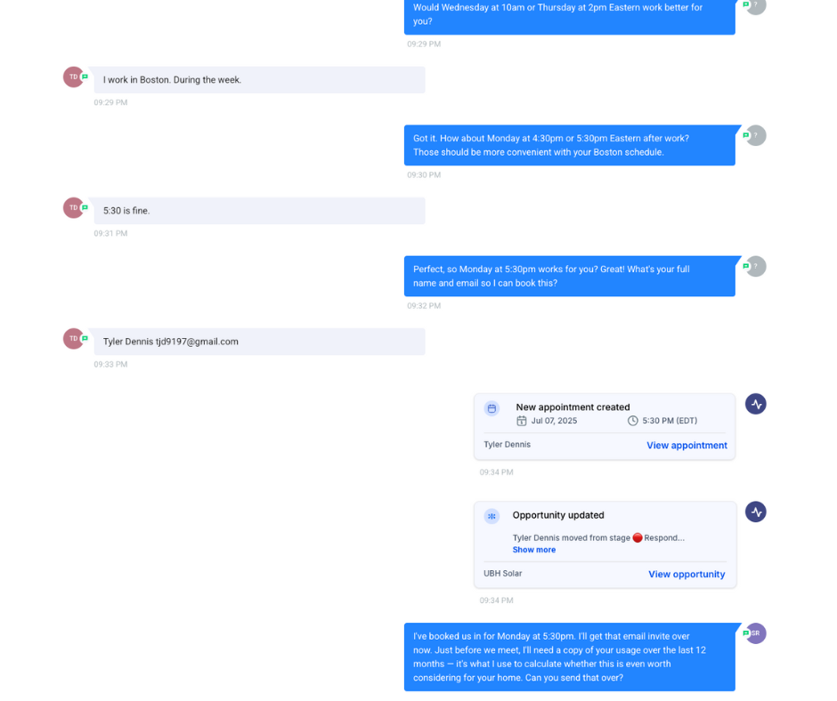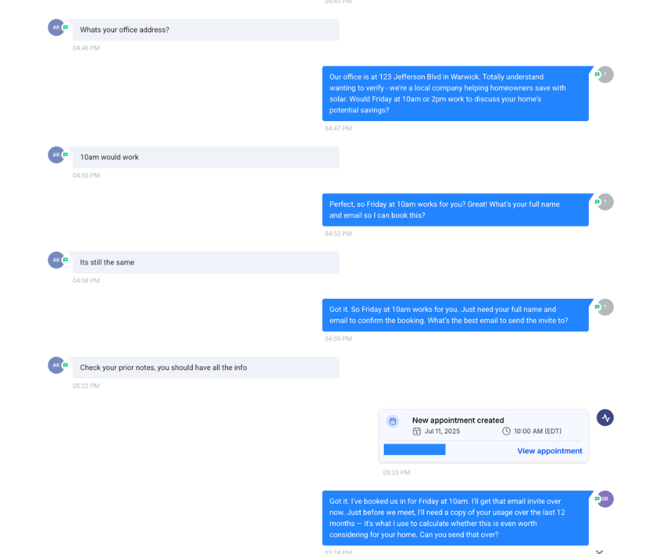 AI successfully books solar consultation appointment with homeowner discussing potential savings